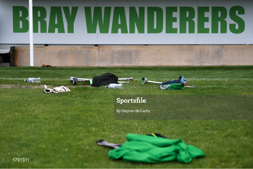 7 September 2019; Crutches are seen at the side of the pitch during the Megazyme Amputee Football League Cup Finals at Carlisle Grounds in Bray, Co Wicklow. Photo by Stephen McCarthy/Sportsfile