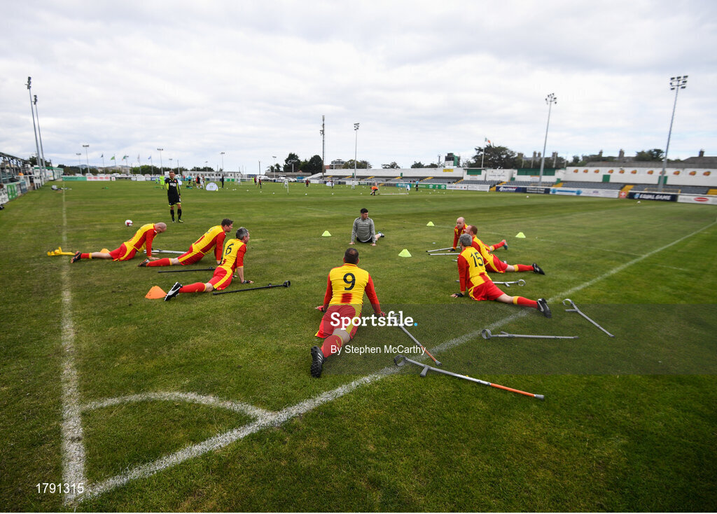 7 September 2019; Partick Thistle players stretch prior to the Megazyme Amputee Football League Cup Finals at Carlisle Grounds in Bray, Co Wicklow. Photo by Stephen McCarthy/Sportsfile