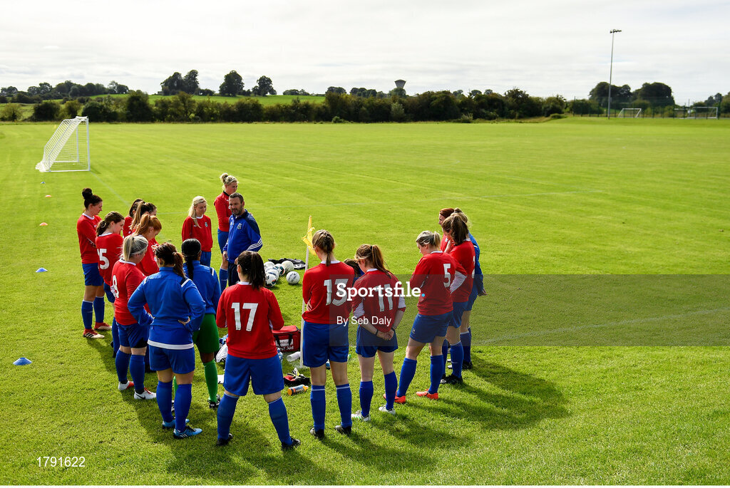 8 September 2019; Manulla FC manager David McDonnell talks to his players prior to the FAI Women’s Intermediate Shield Final match between Manulla FC and Whitehall Rangers at Mullingar Athletic FC in Mullingar, Co. Westmeath. Photo by Seb Daly/Sportsfile