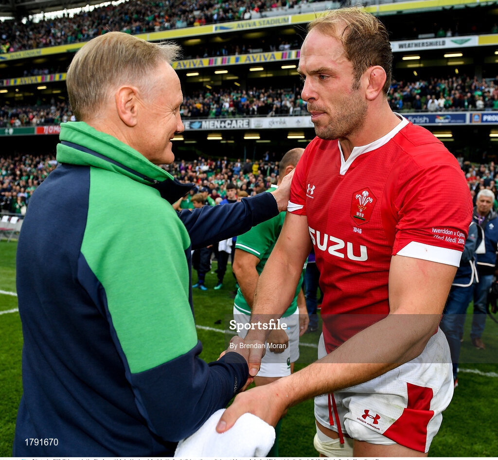 7 September 2019; Wales captain Alun Wyn Jones with Ireland head coach Joe Schmidt after the Guinness Summer Series match between Ireland and Wales at Aviva Stadium in Dublin. Photo by Brendan Moran/Sportsfile