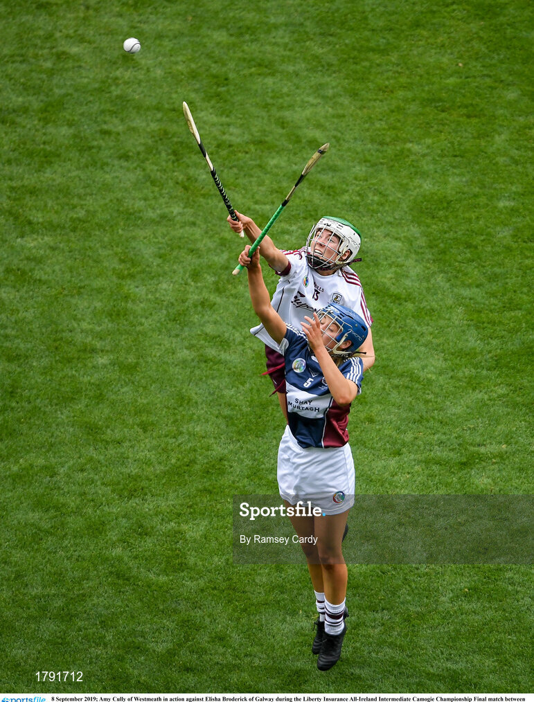 8 September 2019; Amy Cully of Westmeath in action against Elisha Broderick of Galway during the Liberty Insurance All-Ireland Intermediate Camogie Championship Final match between Galway and Westmeath at Croke Park in Dublin. Photo by Ramsey Cardy/Sportsfile