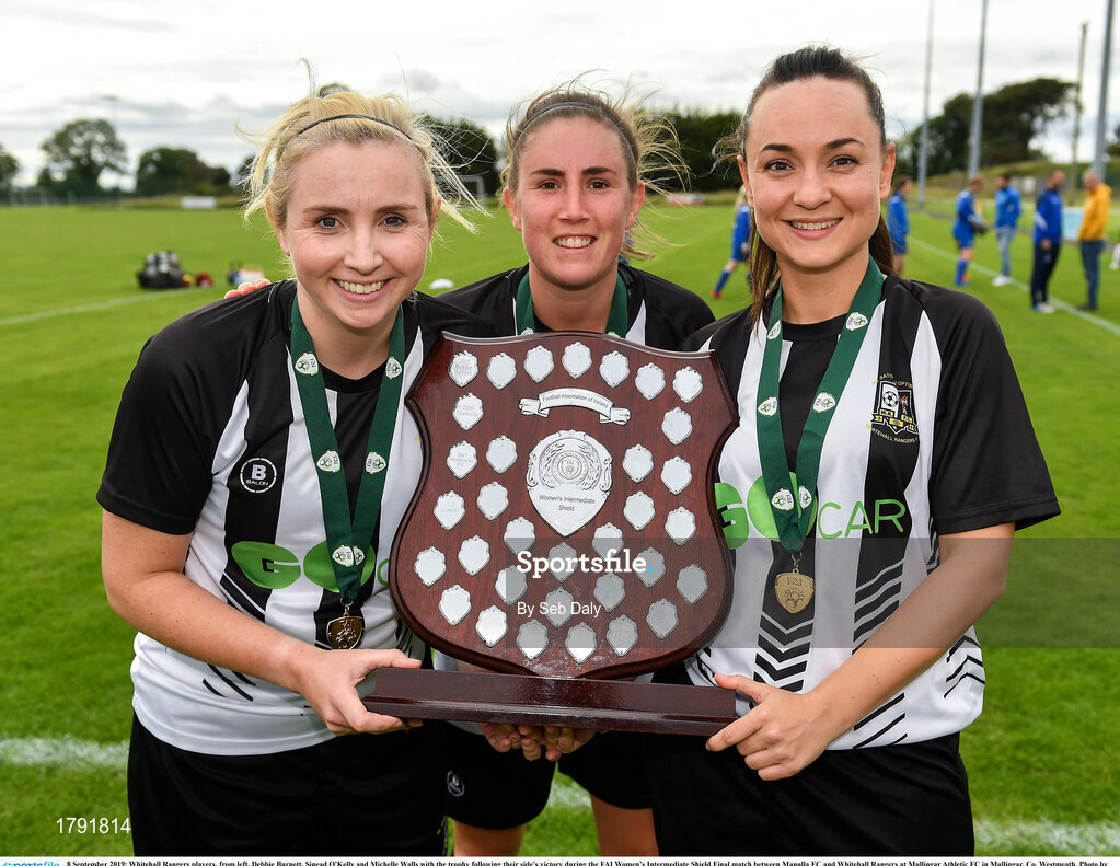 8 September 2019; Whitehall Rangers players, from left, Debbie Burnett, Sinead O'Kelly and Michelle Walls with the trophy following their side's victory during the FAI Women’s Intermediate Shield Final match between Manulla FC and Whitehall Rangers at Mullingar Athletic FC in Mullingar, Co. Westmeath. Photo by Seb Daly/Sportsfile