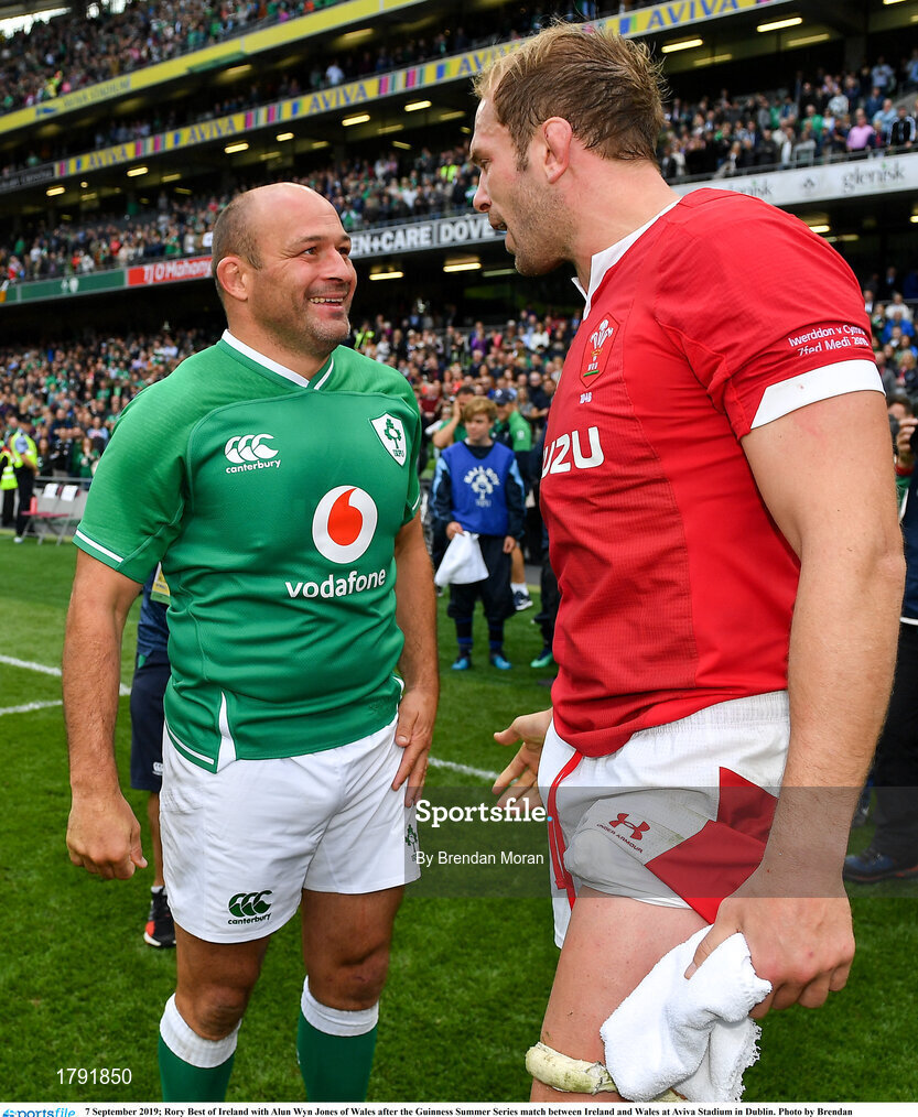 7 September 2019; Rory Best of Ireland with Alun Wyn Jones of Wales after the Guinness Summer Series match between Ireland and Wales at Aviva Stadium in Dublin. Photo by Brendan Moran/Sportsfile