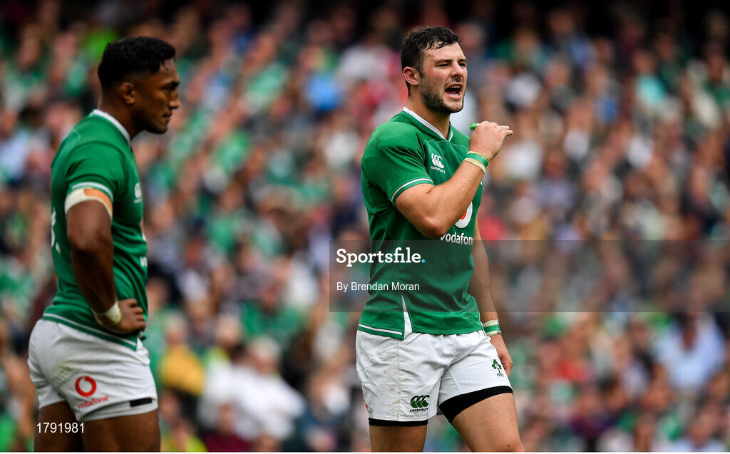 7 September 2019; Robbie Henshaw, right, and team-mate Bundee Aki of Ireland during the Guinness Summer Series match between Ireland and Wales at Aviva Stadium in Dublin. Photo by Brendan Moran/Sportsfile