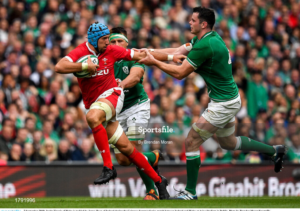 7 September 2019; Justin Tipuric of Wales is tackled by James Ryan of Ireland during the Guinness Summer Series match between Ireland and Wales at Aviva Stadium in Dublin. Photo by Brendan Moran/Sportsfile