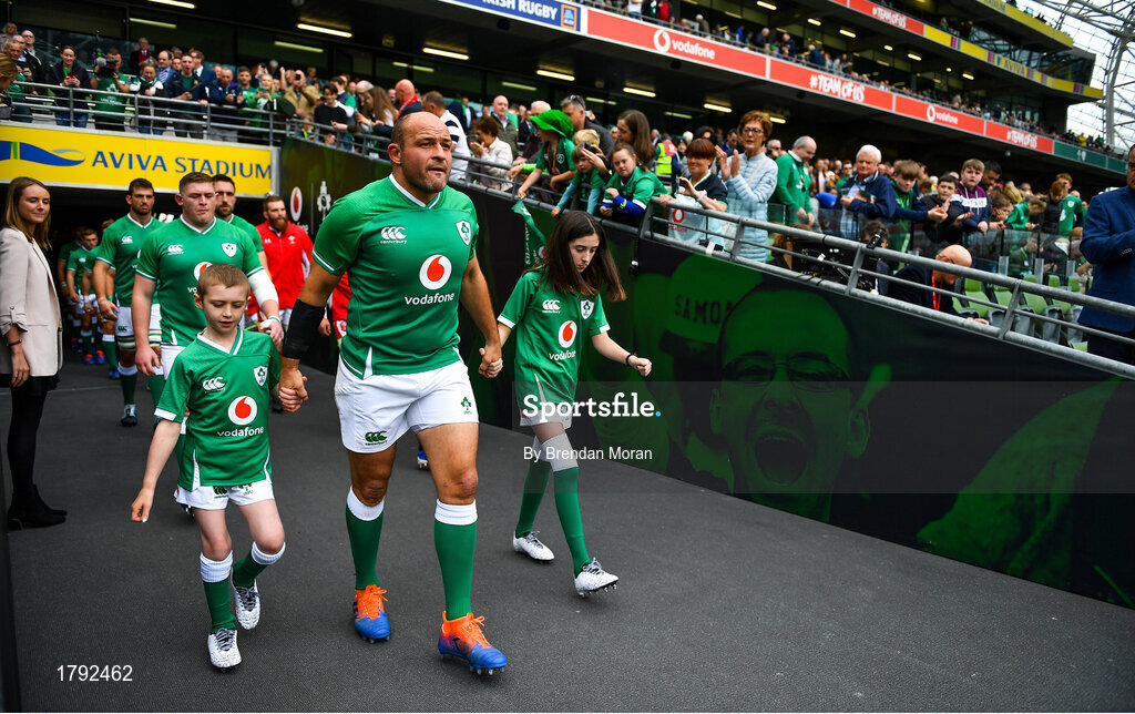 7 September 2019; Ireland captain Rory Best leads the teams out prior to during the Guinness Summer Series match between Ireland and Wales at Aviva Stadium in Dublin. Photo by Brendan Moran/Sportsfile