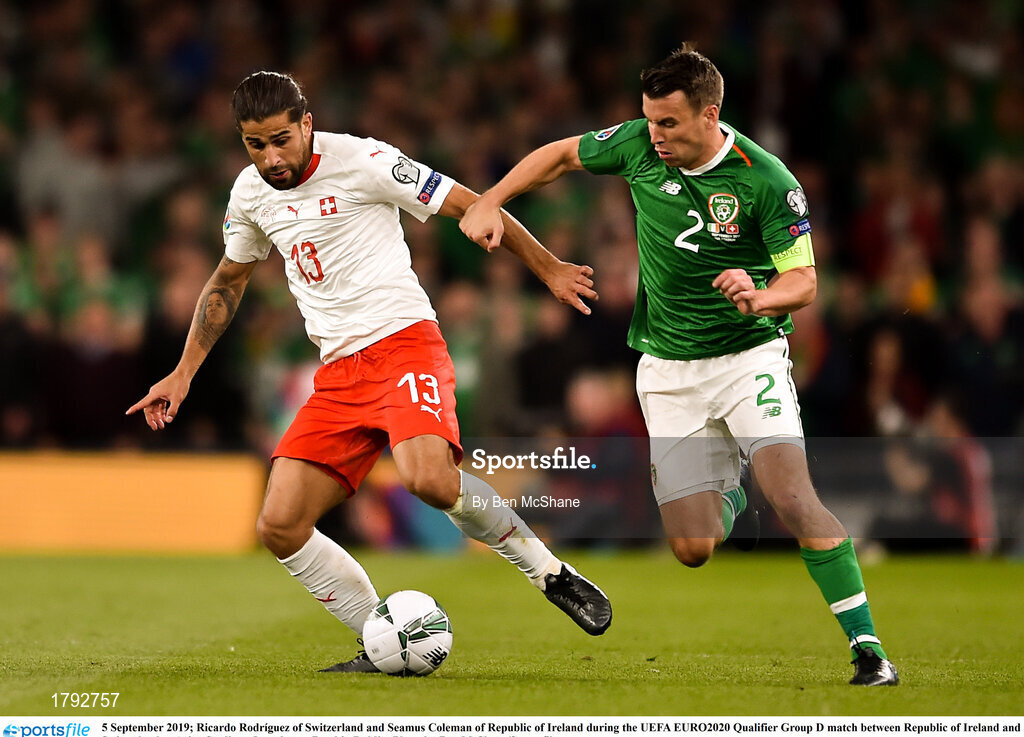 5 September 2019; Ricardo Rodríguez of Switzerland and Seamus Coleman of Republic of Ireland during the UEFA EURO2020 Qualifier Group D match between Republic of Ireland and Switzerland at Aviva Stadium, Lansdowne Road in Dublin. Photo by Ben McShane/Sportsfile