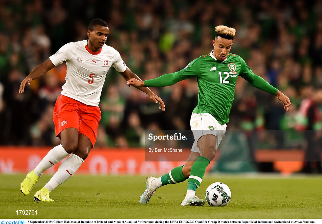 5 September 2019; Callum Robinson of Republic of Ireland and Manuel Akanji of Switzerland during the UEFA EURO2020 Qualifier Group D match between Republic of Ireland and Switzerland at Aviva Stadium, Lansdowne Road in Dublin. Photo by Ben McShane/Sportsfile