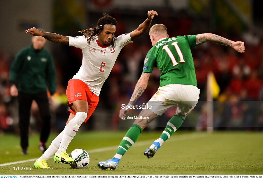 5 September 2019; Kevin Mbabu of Switzerland and James McClean of Republic of Ireland during the UEFA EURO2020 Qualifier Group D match between Republic of Ireland and Switzerland at Aviva Stadium, Lansdowne Road in Dublin. Photo by Ben McShane/Sportsfile