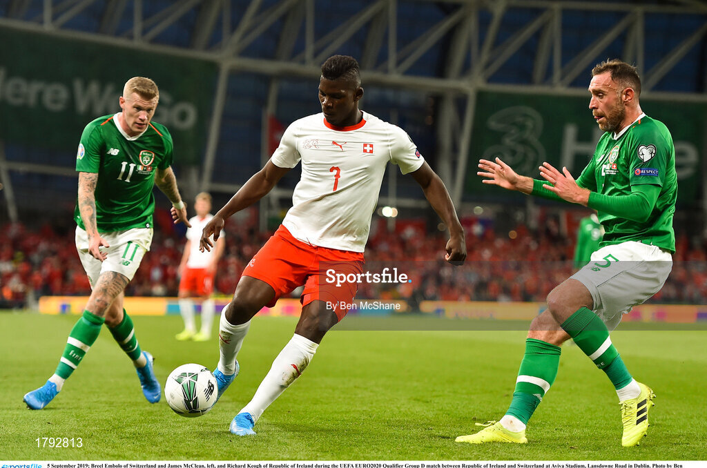 5 September 2019; Breel Embolo of Switzerland and James McClean, left, and Richard Keogh of Republic of Ireland during the UEFA EURO2020 Qualifier Group D match between Republic of Ireland and Switzerland at Aviva Stadium, Lansdowne Road in Dublin. Photo by Ben McShane/Sportsfile