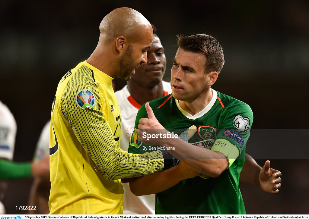 5 September 2019; Seamus Coleman of Republic of Ireland gestures to Granit Xhaka of Switzerland after a coming together during the UEFA EURO2020 Qualifier Group D match between Republic of Ireland and Switzerland at Aviva Stadium, Lansdowne Road in Dublin. Photo by Ben McShane/Sportsfile