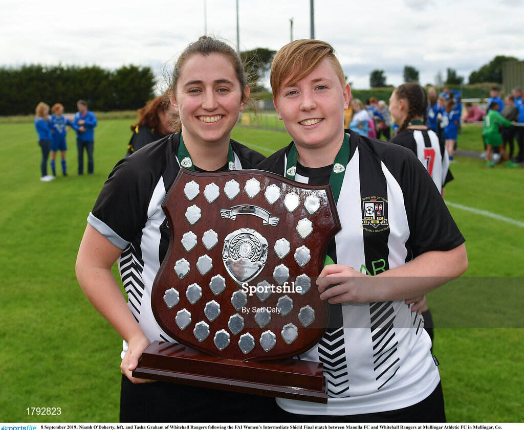 8 September 2019; Niamh O'Doherty, left, and Tasha Graham of Whitehall Rangers following the FAI Women’s Intermediate Shield Final match between Manulla FC and Whitehall Rangers at Mullingar Athletic FC in Mullingar, Co. Westmeath. Photo by Seb Daly/Sportsfile