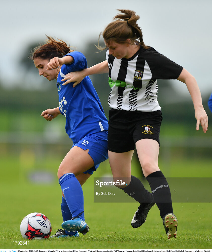 8 September 2019; Aoife Freyne of Manulla FC in action against Helen Cooney of Whitehall Rangers during the FAI Women’s Intermediate Shield Final match between Manulla FC and Whitehall Rangers at Mullingar Athletic FC in Mullingar, Co. Westmeath. Photo by Seb Daly/Sportsfile
