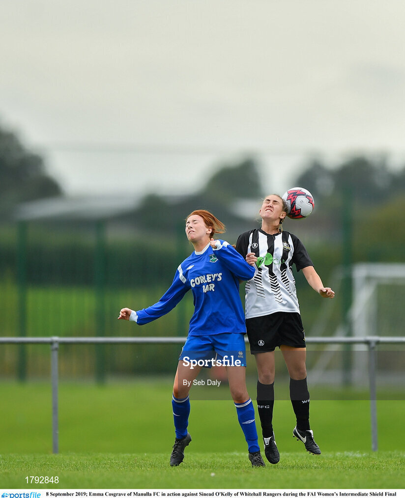 8 September 2019; Emma Cosgrave of Manulla FC in action against Sinead O'Kelly of Whitehall Rangers during the FAI Women’s Intermediate Shield Final match between Manulla FC and Whitehall Rangers at Mullingar Athletic FC in Mullingar, Co. Westmeath. Photo by Seb Daly/Sportsfile