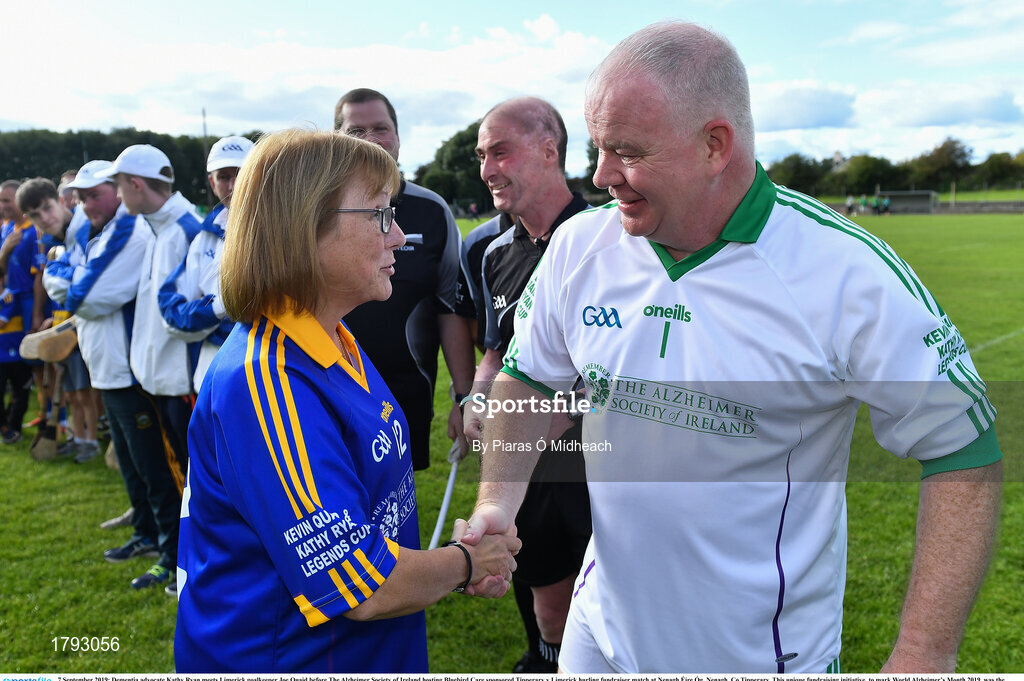 7 September 2019; Dementia advocate Kathy Ryan meets Limerick goalkeeper Joe Quaid before The Alzheimer Society of Ireland hosting Bluebird Care sponsored Tipperary v Limerick hurling fundraiser match at Nenagh Éire Óg, Nenagh, Co Tipperary. This unique fundraising initiative, to mark World Alzheimer’s Month 2019, was the brainchild of two leading Munster dementia advocates, Kevin Quaid and Kathy Ryan, who both have a dementia diagnosis. All the money raised will go towards providing community services and advocacy supports in the Munster area and beyond. Photo by Piaras Ó Mídheach/Sportsfile