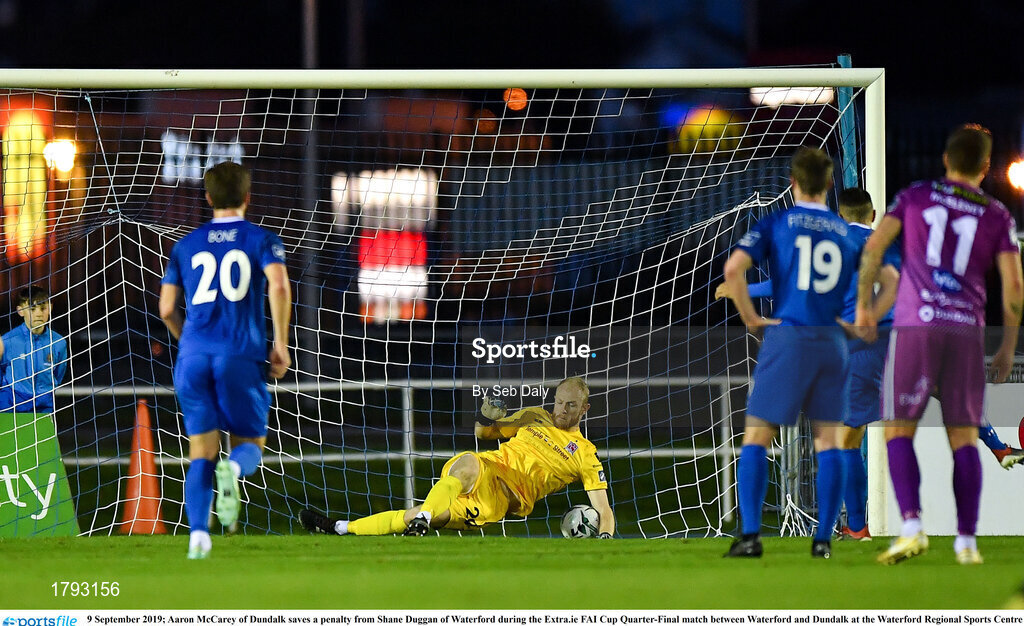 9 September 2019; Aaron McCarey of Dundalk saves a penalty from Shane Duggan of Waterford United during the Extra.ie FAI Cup Quarter-Final match between Waterford and Dundalk at the Waterford Regional Sports Centre in Waterford. Photo by Seb Daly/Sportsfile