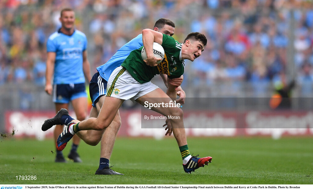 1 September 2019; Seán O'Shea of Kerry in action against Brian Fenton of Dublin during the GAA Football All-Ireland Senior Championship Final match between Dublin and Kerry at Croke Park in Dublin. Photo by Brendan Moran/Sportsfile