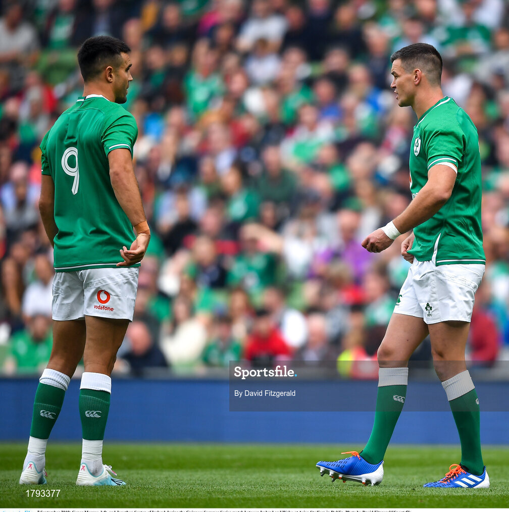 7 September 2019; Conor Murray, left, and Jonathan Sexton of Ireland during the Guinness Summer Series match between Ireland and Wales at Aviva Stadium in Dublin. Photo by David Fitzgerald/Sportsfile