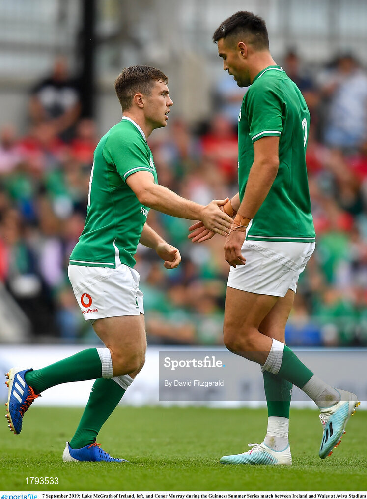 7 September 2019; Luke McGrath of Ireland, left, and Conor Murray during the Guinness Summer Series match between Ireland and Wales at Aviva Stadium in Dublin. Photo by David Fitzgerald/Sportsfile