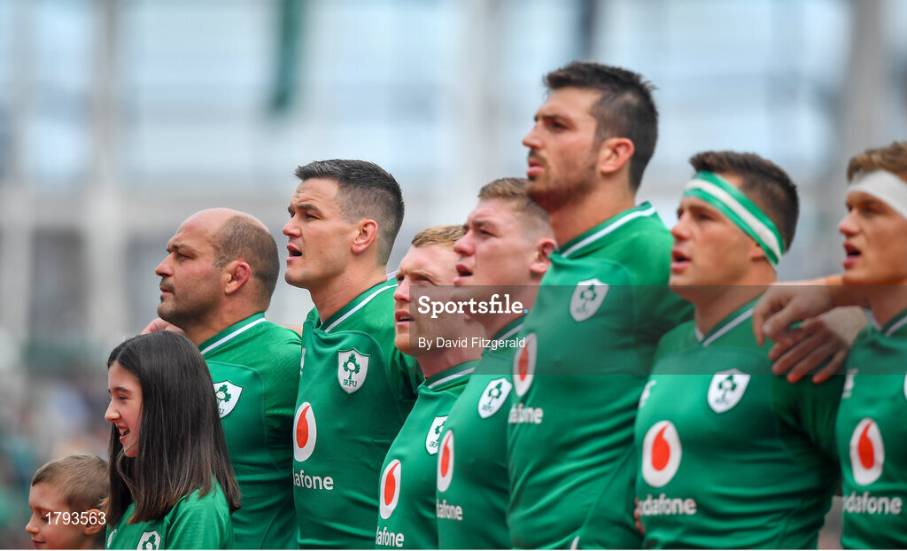 7 September 2019; Ireland players during the national anthem prior to the Guinness Summer Series match between Ireland and Wales at Aviva Stadium in Dublin. Photo by David Fitzgerald/Sportsfile