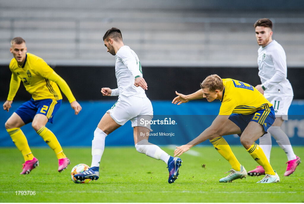 10 September 2019; Daniel Mandroiu of Republic of Ireland in action against Svante Ingelsson of Sweden during the UEFA European U21 Championship Qualifier Group 1 match between Sweden and Republic of Ireland at Guldfågeln Arena in Hansa City, Kalmar, Sweden. Photo by Suvad Mrkonjic/Sportsfile