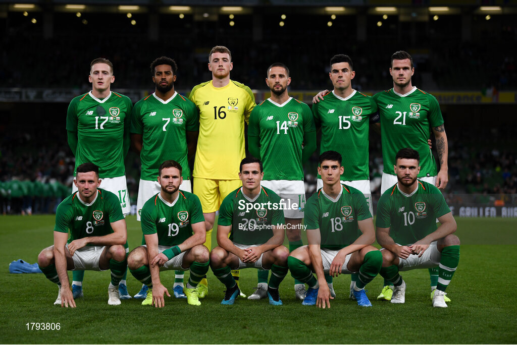 10 September 2019; The Republic of Ireland team, back row, from left, Ronan Curtis, Cyrus Christie, Mark Travers, Conor Hourihane, John Egan, and Kevin Long, and front row, from left, Alan Browne, Alan Judge, Josh Cullen, Callum O’Dowda, and Scott Hogan before the 3 International Friendly match between Republic of Ireland and Bulgaria at Aviva Stadium, Dublin. Photo by Stephen McCarthy/Sportsfile