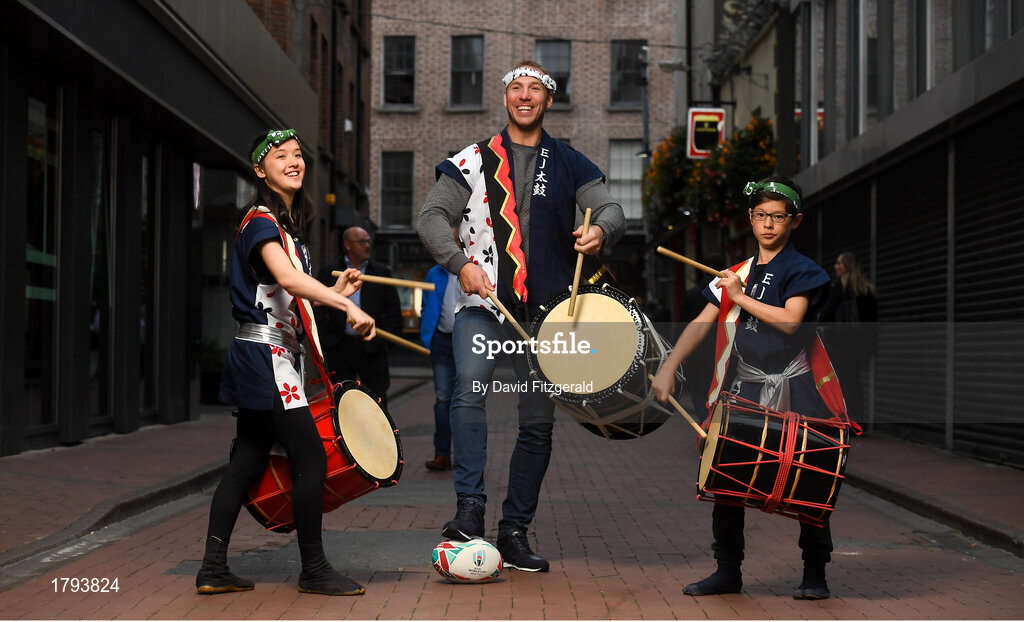 10 September 2019; RTÉ rugby analyst Stephen Ferris in attendance alongside members of the EJ Taiko Team, Sayako O'Donnell, left, age 13, and Louis Bradley, age 11, at the RTÉ Sport Rugby World Cup 2019 Launch at Lemon & Duke, Royal Hibernian Way, Dublin. Photo by David Fitzgerald/Sportsfile