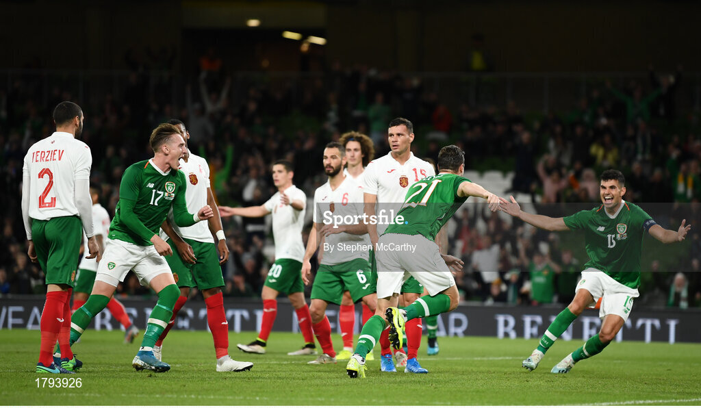 10 September 2019; Kevin Long of Republic of Ireland, 21, celebrates with team-mate John Egan after scoring his side's second goal during the 3 International Friendly match between Republic of Ireland and Bulgaria at Aviva Stadium, Dublin. Photo by Stephen McCarthy/Sportsfile