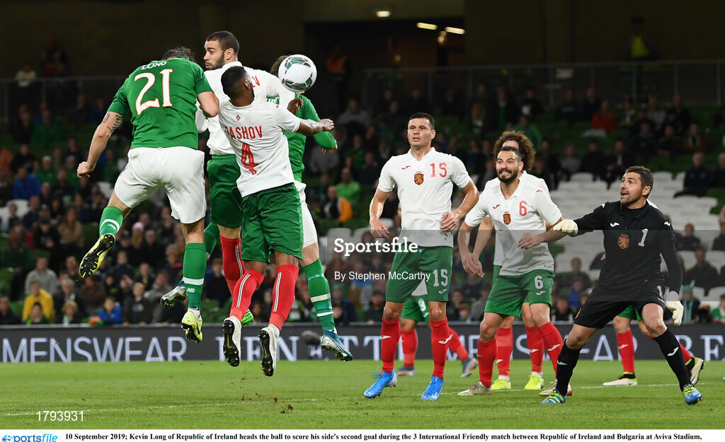 10 September 2019; Kevin Long of Republic of Ireland heads the ball to score his side's second goal during the 3 International Friendly match between Republic of Ireland and Bulgaria at Aviva Stadium, Dublin. Photo by Stephen McCarthy/Sportsfile