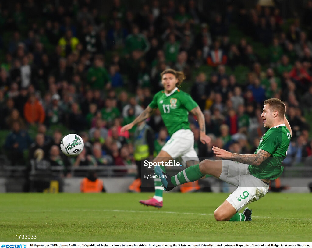 10 September 2019; James Collins of Republic of Ireland shoots to score his side's third goal during the 3 International Friendly match between Republic of Ireland and Bulgaria at Aviva Stadium, Dublin. Photo by Seb Daly/Sportsfile