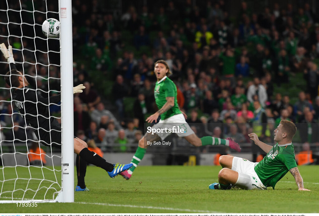 10 September 2019; James Collins of Republic of Ireland shoots to score his side's third goal during the 3 International Friendly match between Republic of Ireland and Bulgaria at Aviva Stadium, Dublin. Photo by Seb Daly/Sportsfile