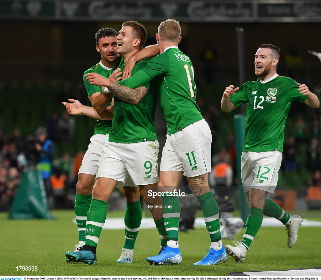 10 September 2019; James Collins of Republic of Ireland is congratulated by team-mates Enda Stevens, left, and James McClean, centre, after scoring his side's third goal during the 3 International Friendly match between Republic of Ireland and Bulgaria at Aviva Stadium, Dublin. Photo by Seb Daly/Sportsfile