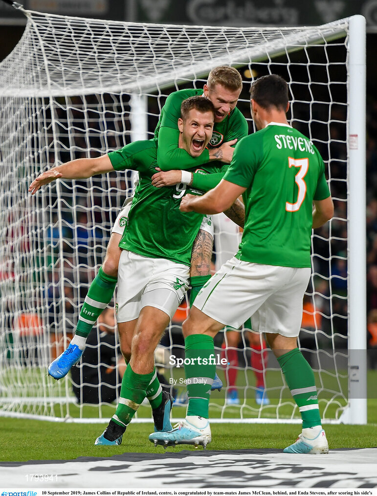 10 September 2019; James Collins of Republic of Ireland, centre, is congratulated by team-mates James McClean, behind, and Enda Stevens, after scoring his side's third goal during the 3 International Friendly match between Republic of Ireland and Bulgaria at Aviva Stadium, Dublin. Photo by Seb Daly/Sportsfile