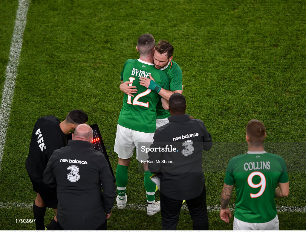 10 September 2019; Jack Byrne of Republic of Ireland embraces Alan Judge as he comes on to make his debut during the 3 International Friendly match between Republic of Ireland and Bulgaria at Aviva Stadium, Dublin. Photo by Ben McShane/Sportsfile