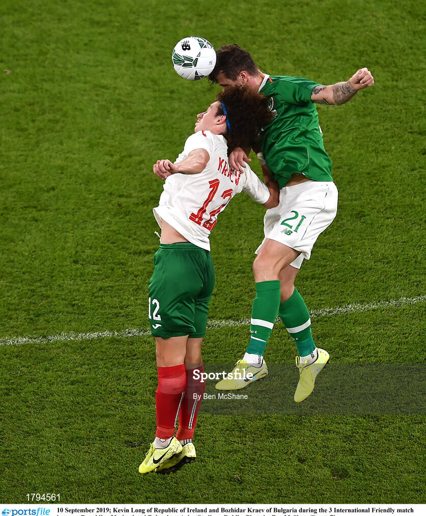 10 September 2019; Kevin Long of Republic of Ireland and Bozhidar Kraev of Bulgaria during the 3 International Friendly match between Republic of Ireland and Bulgaria at Aviva Stadium, Dublin. Photo by Ben McShane/Sportsfile