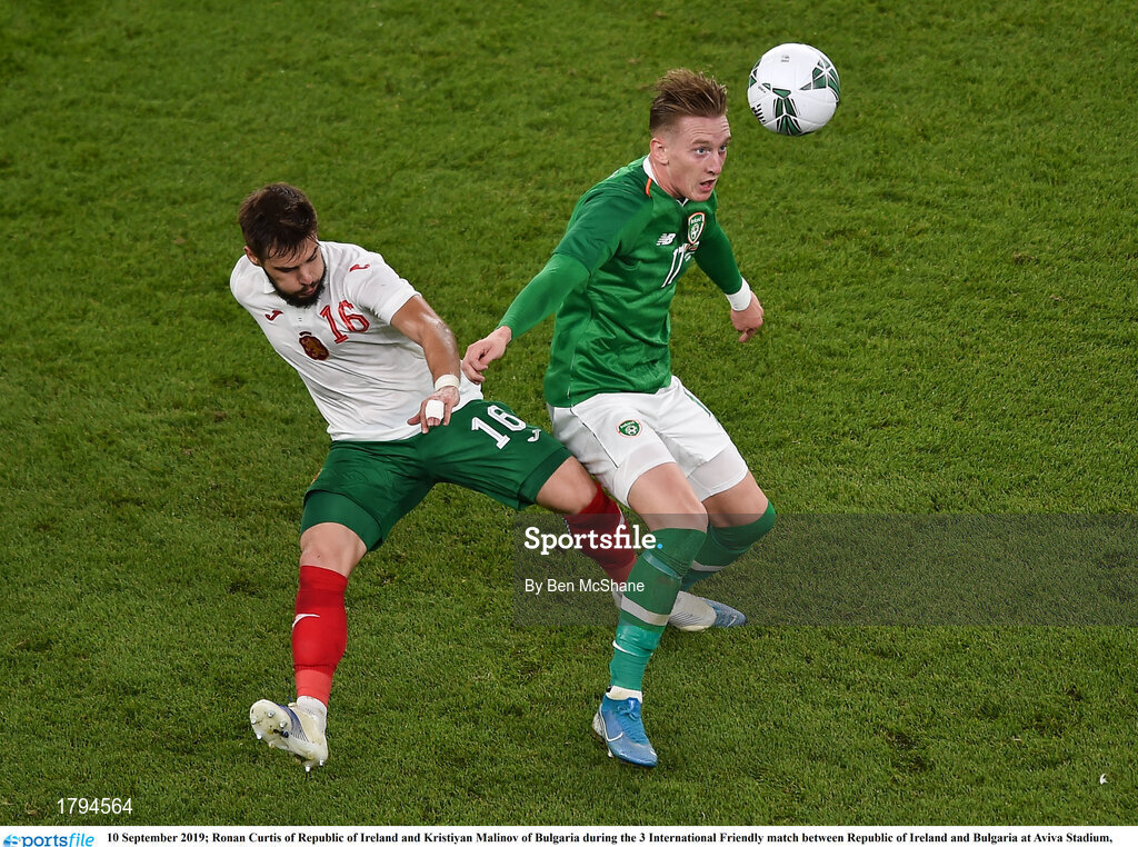 10 September 2019; Ronan Curtis of Republic of Ireland and Kristiyan Malinov of Bulgaria during the 3 International Friendly match between Republic of Ireland and Bulgaria at Aviva Stadium, Dublin. Photo by Ben McShane/Sportsfile
