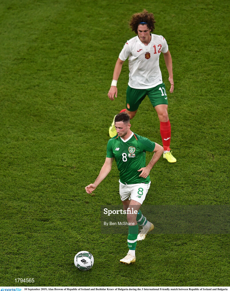 10 September 2019; Alan Browne of Republic of Ireland and Bozhidar Kraev of Bulgaria during the 3 International Friendly match between Republic of Ireland and Bulgaria at Aviva Stadium, Dublin. Photo by Ben McShane/Sportsfile