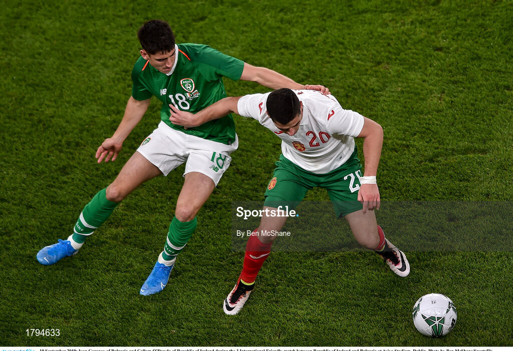 10 September 2019; Ivan Goranov of Bulgaria and Callum O’Dowda of Republic of Ireland during the 3 International Friendly match between Republic of Ireland and Bulgaria at Aviva Stadium, Dublin. Photo by Ben McShane/Sportsfile