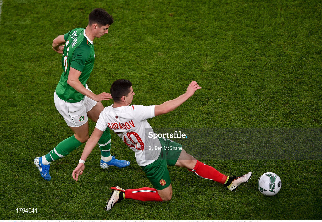 10 September 2019; Ivan Goranov of Bulgaria and Callum O’Dowda of Republic of Ireland during the 3 International Friendly match between Republic of Ireland and Bulgaria at Aviva Stadium, Dublin. Photo by Ben McShane/Sportsfile
