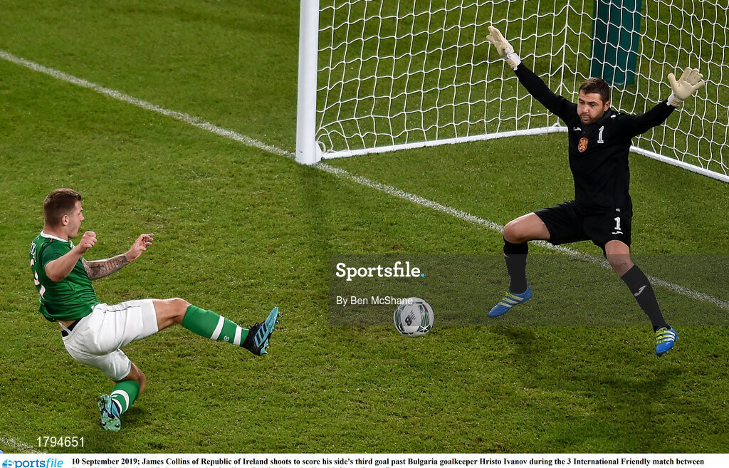 10 September 2019; James Collins of Republic of Ireland shoots to score his side's third goal past Bulgaria goalkeeper Hristo Ivanov during the 3 International Friendly match between Republic of Ireland and Bulgaria at Aviva Stadium, Dublin. Photo by Ben McShane/Sportsfile