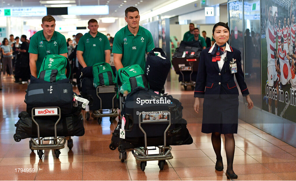 12 September 2019; Jonathan Sexton, right, and Garry Ringrose, left, of Ireland on the squad's arrival in Hanada Airport in Tokyo ahead of the 2019 Rugby World Cup in Japan. Photo by Brendan Moran/Sportsfile