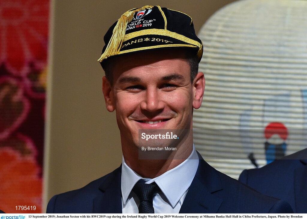 13 September 2019; Jonathan Sexton with his RWC2019 cap during the Ireland Rugby World Cup 2019 Welcome Ceremony at Mihama Bunka Hall Hall in Chiba Prefecture, Japan. Photo by Brendan Moran/Sportsfile