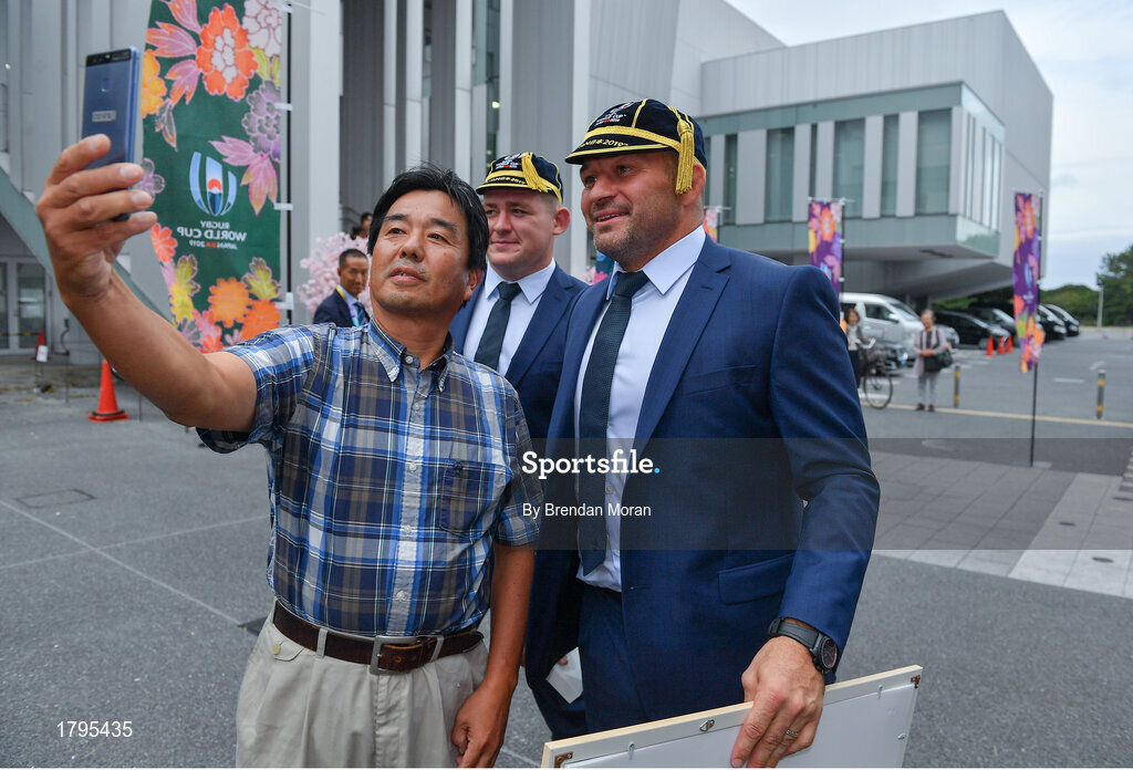 13 September 2019; Ireland captain Rory Best poses for a selfie with a local after the Ireland Rugby World Cup 2019 Welcome Ceremony at Mihama Bunka Hall Hall in Chiba Prefecture, Japan. Photo by Brendan Moran/Sportsfile