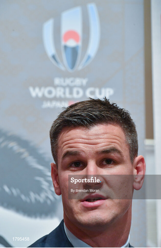 13 September 2019; Jonathan Sexton is interviewed by the media after the Ireland Rugby World Cup 2019 Welcome Ceremony at Mihama Bunka Hall Hall in Chiba Prefecture, Japan. Photo by Brendan Moran/Sportsfile