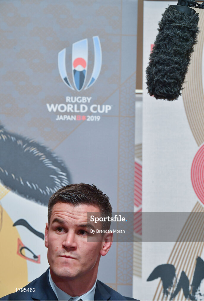 13 September 2019; Jonathan Sexton is interviewed by the media after the Ireland Rugby World Cup 2019 Welcome Ceremony at Mihama Bunka Hall Hall in Chiba Prefecture, Japan. Photo by Brendan Moran/Sportsfile