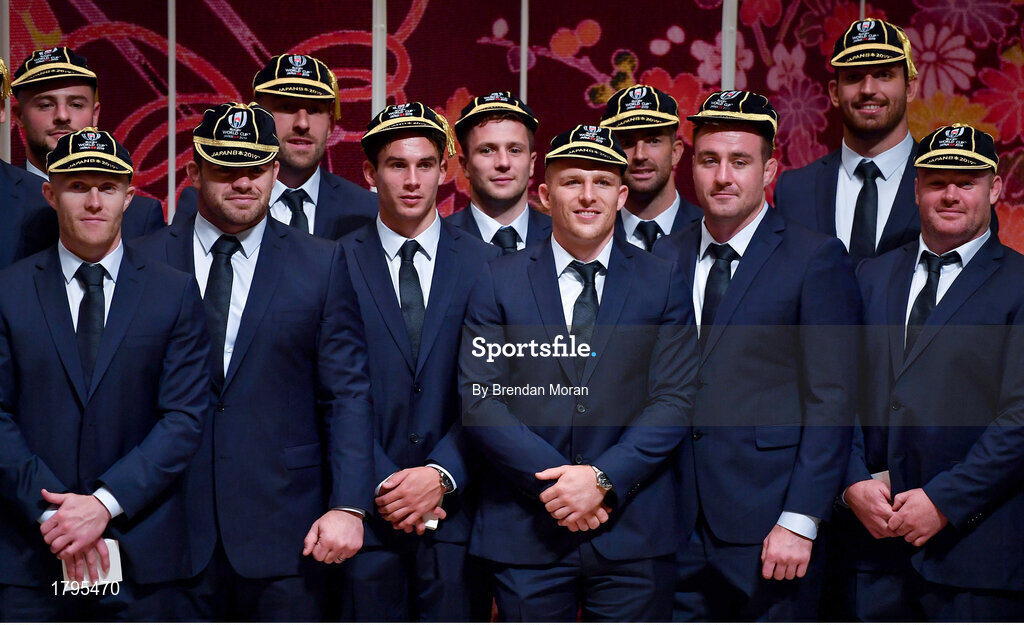 13 September 2019; Ireland players, from left, Robbie Henshaw, Keith Earls, Cian Healy, Jack Conan, Joey Carbery, Jack Carty, Andrew Conway, Rob Kearney, Niall Scannell, Jean Kleyn and Dave Kilcoyne with their RWC2019 caps during their Rugby World Cup 2019 Welcome Ceremony at Mihama Bunka Hall Hall in Chiba Prefecture, Japan. Photo by Brendan Moran/Sportsfile