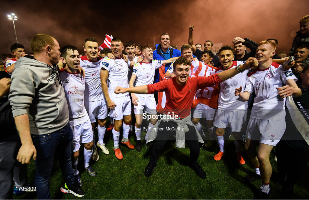 13 September 2019; Shelbourne players and supporters celebrate promotion to the SSE Airtricity League Premier Division following the SSE Airtricity League First Division match between Drogheda United and Shelbourne at United Park in Drogheda, Louth. Photo by Stephen McCarthy/Sportsfile