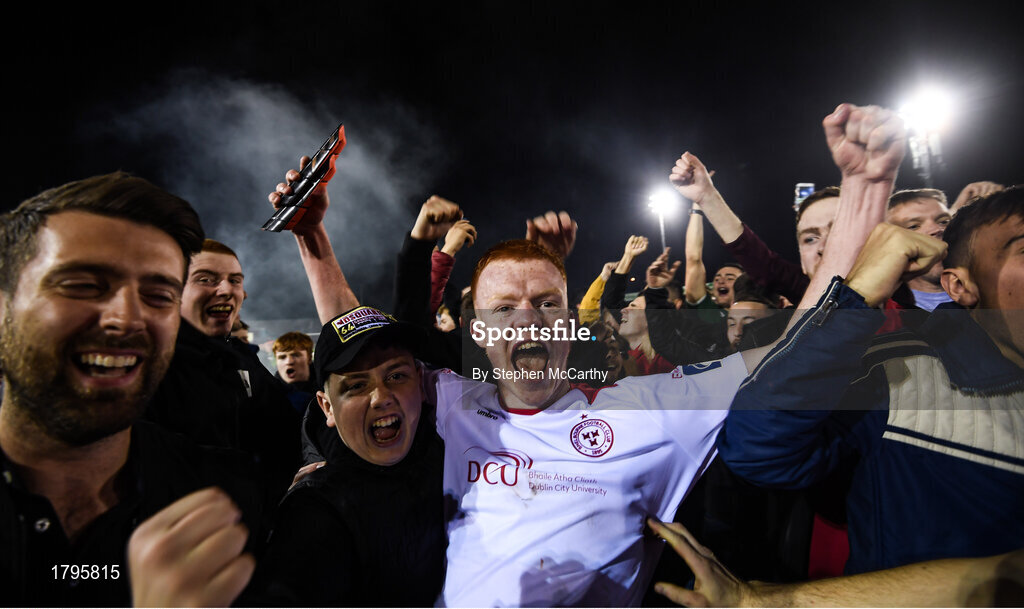 13 September 2019; Shane Farrell of Shelbourne with supporters as they celebrate promotion to the SSE Airtricity League Premier Division following the SSE Airtricity League First Division match between Drogheda United and Shelbourne at United Park in Drogheda, Louth. Photo by Stephen McCarthy/Sportsfile