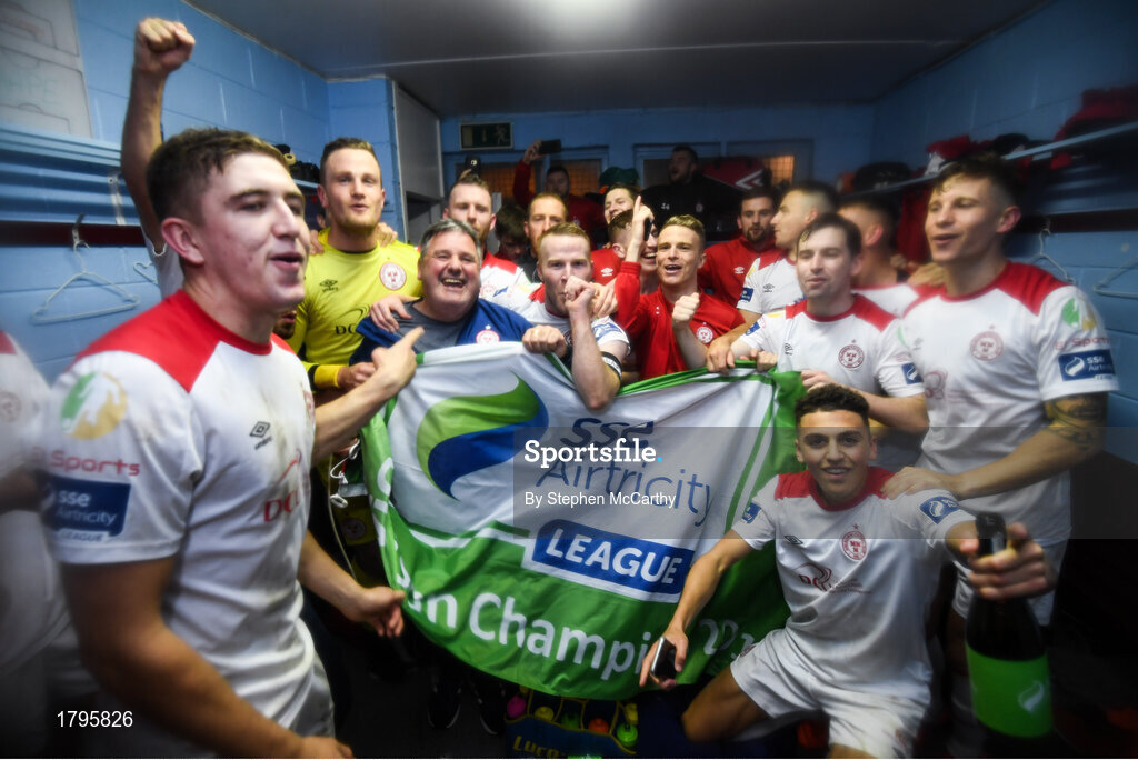 13 September 2019; Shelbourne players celebrate promotion to the SSE Airtricity League Premier Division following the SSE Airtricity League First Division match between Drogheda United and Shelbourne at United Park in Drogheda, Louth. Photo by Stephen McCarthy/Sportsfile