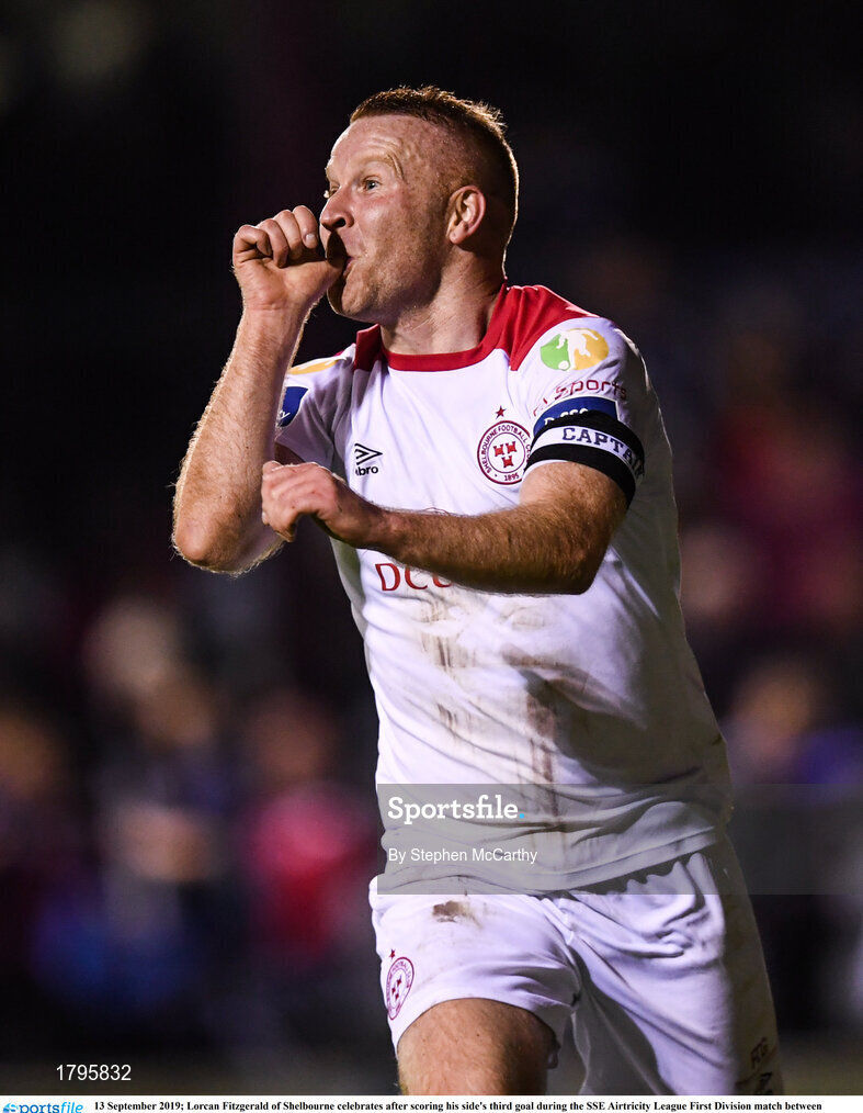 13 September 2019; Lorcan Fitzgerald of Shelbourne celebrates after scoring his side's third goal during the SSE Airtricity League First Division match between Drogheda United and Shelbourne at United Park in Drogheda, Louth. Photo by Stephen McCarthy/Sportsfile